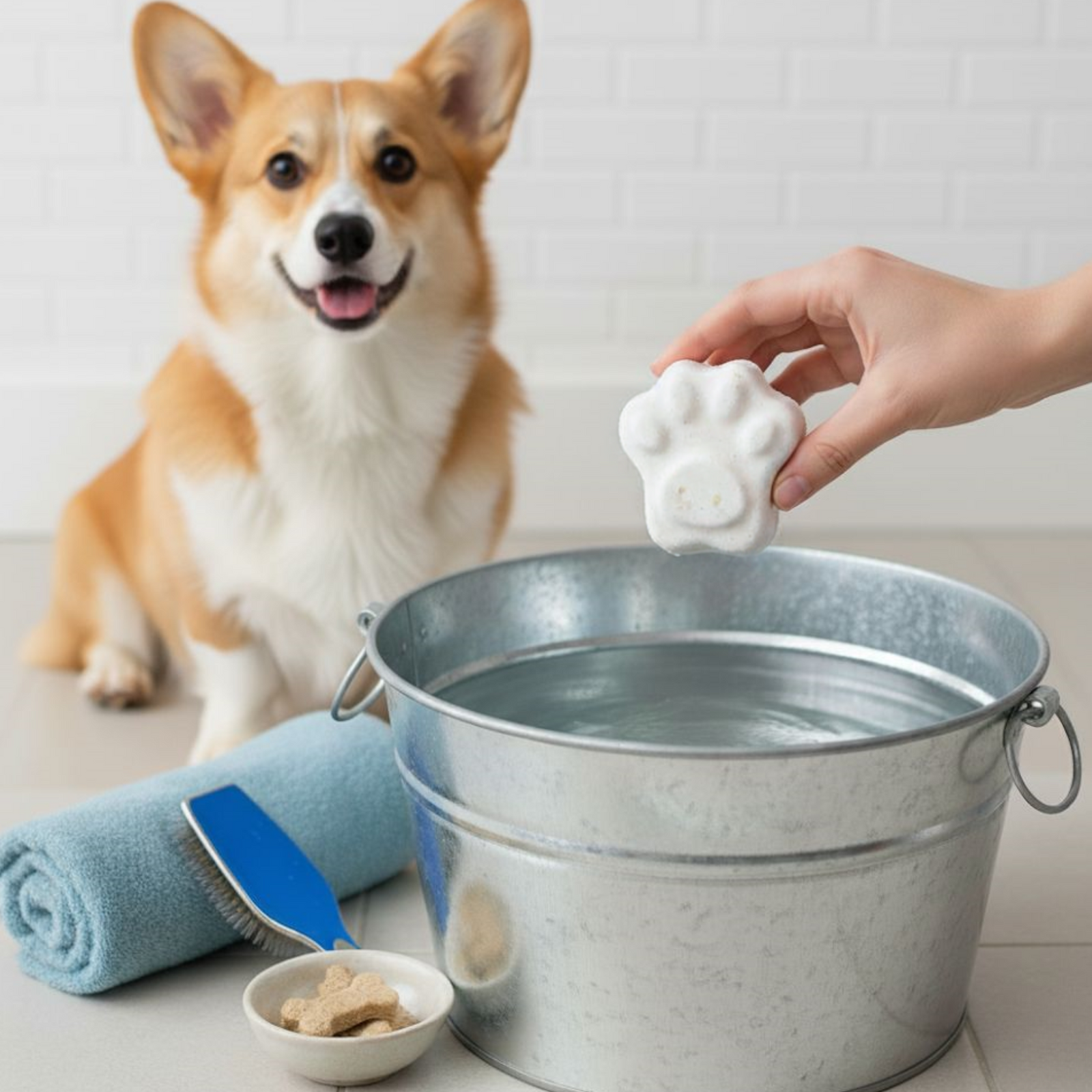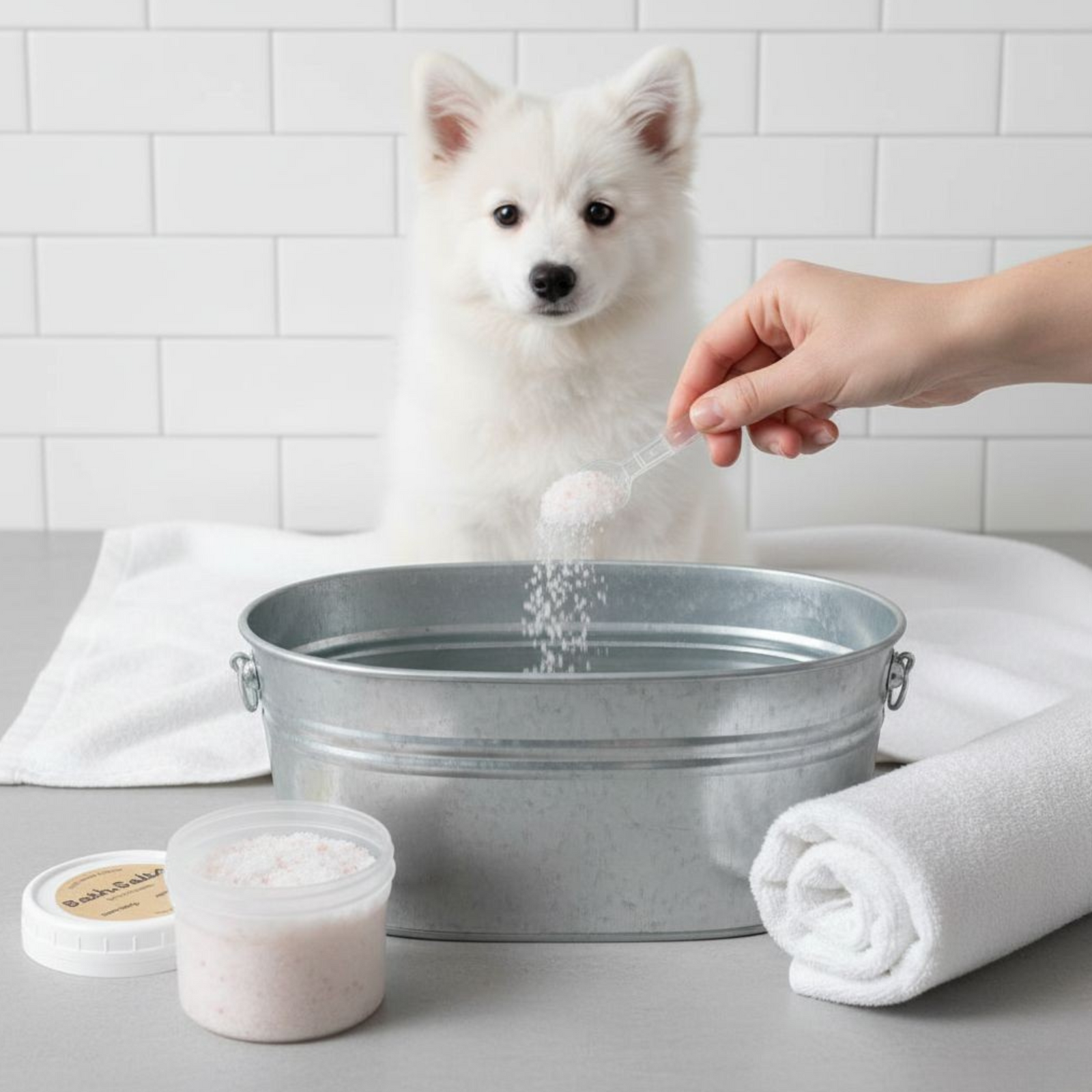4. Drop in the bath bomb and let it fizz / Add scoopfuls of bath salts depending on size of pup