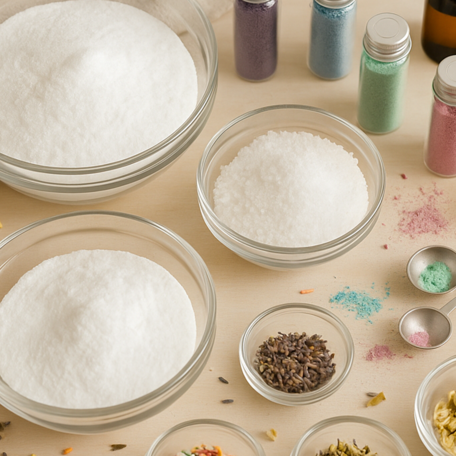 Sodium Bicarbonate, Citric Acid, Cornstarch, Epsom Salt, Kaolin Clay, Cream of Tartar, Essential Oil, Olive Oil, Food Colouring, Polysorbate 80, Witch Hazel, Isopropyl Alchohol. May contain botanicals or mica for some.